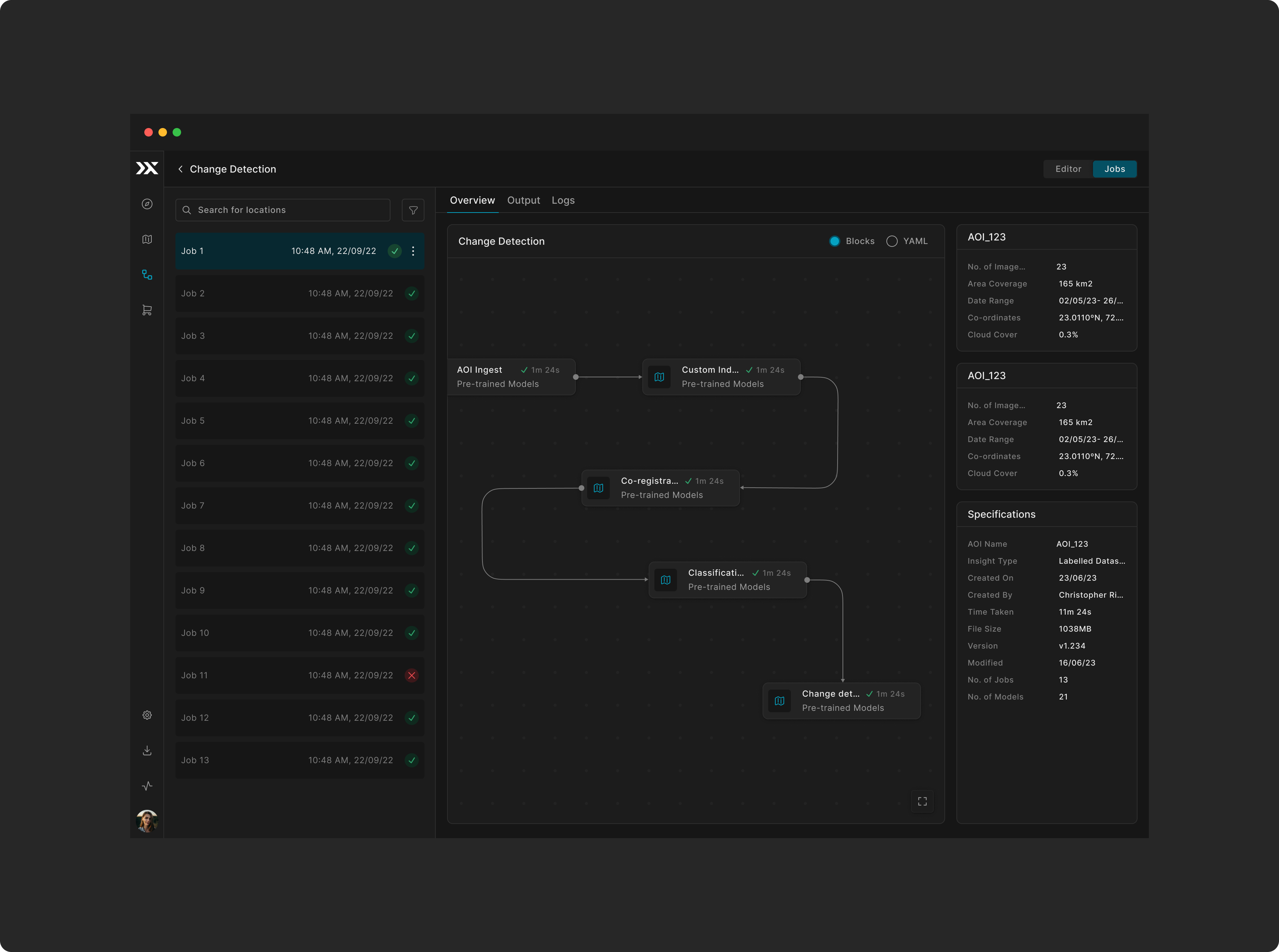 Core Features include a node-based interface with drag-and-drop model chaining, real-time feedback and comprehensive error states, progress tracking with detailed execution insights, and interactive visualization of analysis results.